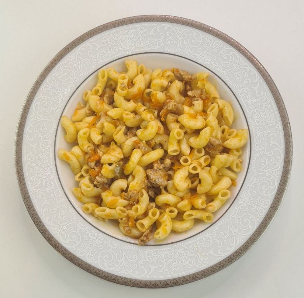 Макароны, свинина, лук, морковь, лечо, растительное масло, специи